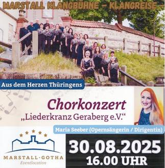 Die Sängerinnen und Sänger vom Liederkranz Geraberg e.V. werden am 30.08.2025 um 16:00 Uhr in Gotha, in der Marstall Klangbühne, unter der Leitung unserer Chorleiterin Maria Seeber ein Gastkonzert geben. Ein buntes Programm erwartet die Zuhörerinnen und Zuhörer. Bei Interesse an diesem Konzert können Sie Karten unter dem Link: https://tickets.step-la-dance.de/shop/2169/marstall-klangbuehne-chorkonzert-liederkranz-geraberg-62 vorbestellen.