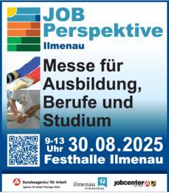 Am 30. August 2025 findet in der Festhalle Ilmenau von 09 bis 13 Uhr die Messe „JOB Perspektive Ilmenau“ statt.
