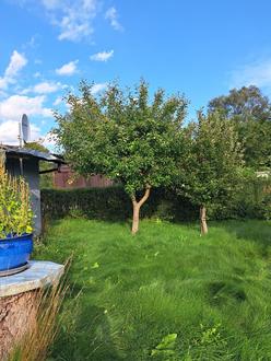 Der Garten ist 330 m² groß, hat 3 Apfelbäume und 1 Gewächshaus. Der Preis für die Laube und die Pflanzen kann verhandelt werden.