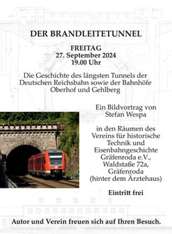 Am Freitag, 27.09.2024 um 19.00 Uhr findet in unseren Vereinsräumen die Buchvorstellung zum 140 jährigen Bestehen des Brandleitetunnels an der Eisenbahnstrecke Gräfenroda- Oberhof statt.