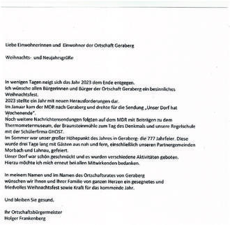 Ich wünsche allen Bürgerinnen und Bürger der Ortschaft Geraberg ein besinnliches Weihnachtsfest.