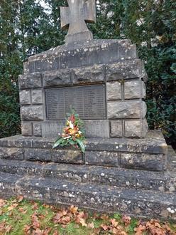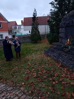Vor dem Ehrenmal der gefallenen Soldaten des 1. Weltkrieges wurden Blumen niedergelegt. Mit Musik und Gebet wurde der vielen Toten gedacht, die durch Kriege und Gewalt ihr Leben lassen mussten. Die gegenwärtige Entwicklung in der Welt, in Europa und in unserem Land muss bewusst machen, was uns Hass und Vernichtung bringen. Nicht nur den Tod vieler, meist junger Soldaten, sondern auch Leid, Tod und Zerstörung für die zivile Gesellschaft, mit dem Resultat einer wiederkehrenden, neuen hasserfüllten Generation.