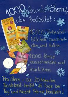 Um einen Stern zu falten, benötigt man 16 Teebeuteltütchen. Dies bedeutet in der Summe für die 1000 bunten, gefalteten Sterne: Insgesamt 16.000 Teebeuteltüten zuschneiden und falten, 1000 Kreise ausschneiden und markieren anschließend alles zum Papierstern aufkleben und mit viel Liebe verpacken. Für einen Stern beträgt der zeitliche Aufwand ca. 20 Minuten, was für die Menge von 1000 Sternen einer Bastelzeit von 14 Tagen entspricht, wenn man Tag und Nacht bastelt.