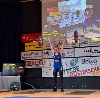 Franziska zeigte 3 starke Versuche und die neue Rekordlast von 70 kg im letzten. Damit erkämpfte sie Silber und holte 2 neue Landesrekorde im Stoßen und Zweikampf.