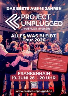 Die Tour 2026 von Project Unplugged startet am 19.06. in Frankenhain mit dem Konzert „DAS BESTE AUS 15 JAHREN - ALLES WAS BLEIBT “. Dazu startet ab sofort der Kartenverkauf mit einem ermäßigten Preis von 29,00 € / Kinder 15,00 € in folgenden Vorverkaufsstellen: