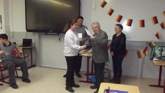 Die Preise für die ersten drei Plätze wurden von Maryse, Erhard und Wissam überreicht. Die Prämierungen bestanden jeweils aus einem Geschenk aus Vouziers sowie einem wertvollen Gutschein des Vereins. Der Wettbewerb hat dem Direktor Sven Kummer, Lehrern beider Schulen, Eltern und vielen Zuschauern Aufmerksamkeit und Freude bereitet. Es war eine gelungene und erfolgreiche Veranstaltung, die nach Wiederholung ruft.