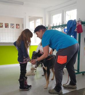 Die Tierärztin Frau Lindisch besuchte uns mit ihren 2 Huskys. Gemeinsam erarbeiteten wir, was es für verschiedene Hunderassen gibt, welche Aufgaben sie erfüllen können und wie man einen Hund richtig ernährt und pflegt. Sehr spannend für alle Kinder waren ihre Ausführungen zum Thema: Wie verhalte ich mich, wenn mir ein fremder Hund begegnet oder wenn ich einen fremden Hund streicheln möchte. Dies durften alle mutigen Kinder mit ihren mitgebrachten 2 Hunden trainieren. Außerdem besuchten uns einige Muttis und Vatis mit ihren Haustieren im Hort. Wir konnten Ben’s Kater, Maries Häschen und Melissas Meerschweinchen bewundern, füttern und sogar streicheln. Diese Kinder berichteten uns ganz stolz, wo ihre Haustiere leben und wie sie richtig gepflegt werden müssen.