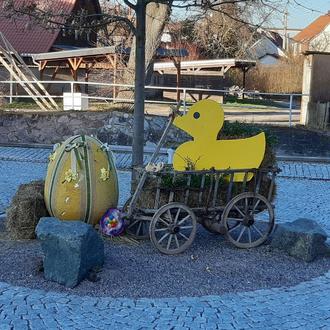 Am Frauentag schmückte eine Gruppe Frauen vom Geraberger Heimatverein den Dorfplan und die umliegenden Brücken mit Osterschmuck.