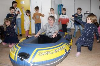 Das anschließende Programm ist gut vorbereitet, perfekt einstudiert und bunt gemischt. Es bietet neben Tanz- und Gesangseinlagen (durch die Kinder sowie die Kolleginnen und Kollegen) auch einen Rückblick auf die 46 Jahre währende Dienstzeit von Ingrid Heyer. Beim „Roten Gummiboot“ ist sie selbst mit vollem Einsatz dabei.