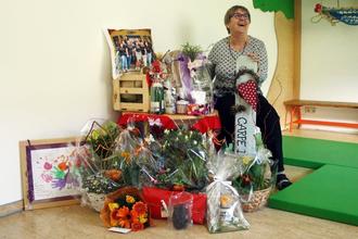 Im nächsten Programmteil werden ihr von den Kindern der verschiedenen Gruppen Präsente „für das Rentnerdasein“ überreicht. Der Gabentisch ist sehr gut gefüllt.