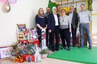 Nachdem sich Frau Möller von ihrer Kollegin im Namen aller Kinder und Angestellten verabschiedet hat, finden auch Bürgermeister Dominik Straube und Stefan Walther in Form eines auf Frau Heyer abgestimmten Reimes dankende Worte. Sie überreichen einen Präsentkorb und Gutscheine. Auch der amtierende Ortschaftsbürgermeister René Buhr, ehemaliger Ortschaftsbürgermeister (und Ehemann) Berg Heyer, ehemaliger Bürgermeister Ralf Groteloh und der Elternbeirat verabschieden sich von ihr. Sie zollen große Dankbarkeit für die langjährige Betreuung der Kleinsten.