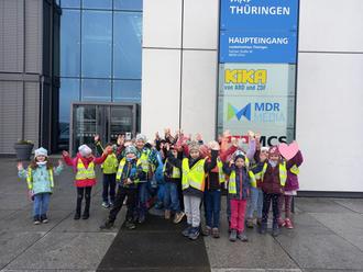 Schon zu Wochenbeginn wurden unsere Großen kribbelig und schwärmten davon, dass sie bald zum Fernsehen fahren dürfen. Am 18.04.2023 war es endlich soweit - nach einem ausgiebigen Frühstück fiel der Startschuss für einen weiteren Höhepunkt unserer diesjährigen Schulanfänger. Schuhe & Jacke an, Warnweste drüber und dann alle rein in die Feuerwehrbusse. In Erfurt angekommen, liefen wir vom Parkplatz zum Hauptgebäude des KiKAs, wo wir unser erstes großes Gruppenfoto mit dem Kikaninchen machten. Das Kikaninchen hatten wir auch auf der Fahrt schon mehrfach auf Stromkästen entdeckt!