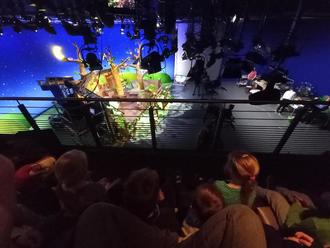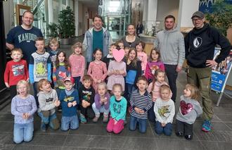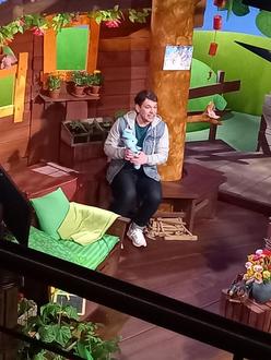 Nach getaner Arbeit wartete eine ganz besondere Überraschung auf uns. Wir hatten das große Glück, dass ausgerechnet während unserer Besuchszeit eine Folge „Baumhaus“ gedreht wurde. Weil wir leise wie die Mäuschen sein können, durften wir der Produktion der Sendung beiwohnen. Wir stiegen hoch auf die Publikumsränge und bewunderten zunächst die ganze Technik. Unheimlich viele Scheinwerfer, Kameras, Monitore und Mikrofone waren im gesamten Raum verteilt. Außerdem begrüßte uns Juri - der Moderator der Sendung. Er erklärte uns, wie alles beim Fernsehen funktioniert und ging dann „ON AIR“. Nach 15 Minuten war die Sendung im Kasten und wird am 05.05.2023 ausgestrahlt. Juri nahm sich sogar noch die Zeit, ein Gruppenfoto mit uns zu machen.
