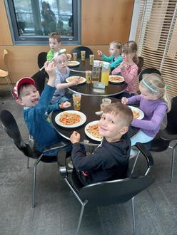 Nach all der Aufregung hatten wir riesigen Hunger - gut, dass schon leckere Nudeln & Tomatensoße auf uns warteten! Gesättigt und glücklich gingen wir zurück zu den Feuerwehrbussen und fuhren wieder in unseren Kindergarten. Gegen 14.00 Uhr waren alle wohlbehalten angekommen und durften später mit ihren Fidis nach Hause gehen.