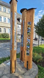 Bereits 2009 wurde das Projekt „Der Mensch brauch den Baum“ am Markt Großbreitenbach eingeweiht. Jetzt wurde es restauriert und wie uns die Firma Zimmerei Staude mitteilte, war es sehr schwierig, die Porzellanplatten aus dem gealterten Holstämmen ohne Schaden herauszubekommen.
