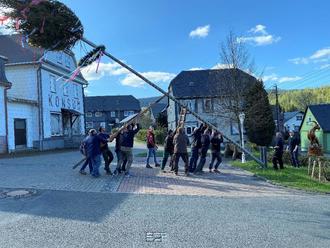 Am 30.04.2023 wurde von den Kameraden der Feuerwehr der diesjährige Maibaum aufgestellt. Die Frauen vom Heimat- und Geschichtsverein schmückten ihn vorher mit bunten Bändern.
