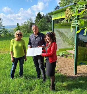 Landrätin Petra Enders überreichte in den Morgenstunden des 23.05.2024 am Wanderparkplatz "Naturpark-Tor "Langer Berg" oberhalb Herschdorfs einen Check in Höhe von 5.000,00 € für den entstehenden Wichtelpfad für Kinder und deren Familien an unseren Bürgermeister Peter Grimm.