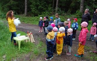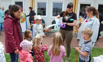 Am Ende der Wanderung gab es für alle Kinder ein Eis vom Eismann. Herr Meder hatte alle Lieblingseissorten der Kinder dabei! Nach kurzer Mittagsruhe hatten die Kindergartenwichtel am Nachmittag ihre Eltern und Geschwister zu sich in den Kindergarten eingeladen. Die Kinder konnten Würstchen am Feuer grillen, gemeinsam mit 2 Papas die bei der Freiwilligen Feuerwehr sind. Sie konnten von ihren Erzieherinnen geschminkt werden, es gab Tattoos und Figurenluftballons und sogar ein Glücksrad, bei dem die Kinder viele Preise gewinnen konnten.