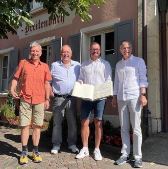 Auch das „Ehrenbuch“ der Stadt Großbreitenbach. Denn einen würdigen Eintrag sollte es auch erhalten. Begehen wir doch in diesem Jahr das 25-jährige Jubiläum der Städtepartnerschaft zwischen Großbreitenbach und Breitenbach in der Schweiz. Gemeindepräsident Dr. Dieter Künzli und der Leiter der Gemeindeverwaltung Andreas Dürr würdigten mit ihren Unterschriften im Ehrenbuch die eingegangene Partnerschaft und hoffen auf weitere gegenseitige Austauschbesuche!
