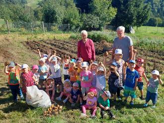 Gemeinsam mit einem Handpflug und dem Nachbar Peter wurden 3 Reihen des kleinen Kartoffelfeldes aufgepflügt. Die Kinder staunten nicht schlecht, als viele kleine und große Kartoffeln zum Vorschein kamen. Schnell sammelten sie alle Kartoffeln in einen Korb. Die Kinder waren so eifrig bei der Sache, dass ein Korb nach dem anderen in einen Sack ausgeschüttet werden konnte. Dabei wurden viele Fotos gemacht und eine besonders große Kartoffel wurde auf den Heimweg in den Kindergarten mitgenommen.