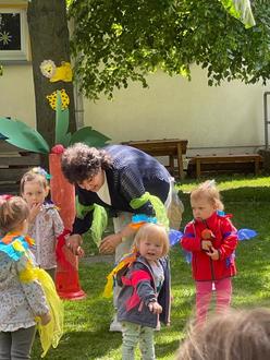 Weiter ging es zu den kleinen Schlangen, die sich gemeinsam auf den Weg zum Fluss machten. In einem kleinen Mitmachlied zeigten die Kinder der Bienengruppe, wie man zusammen kuschelt, auch mal streitet - und sich am Ende natürlich wieder versöhnt.