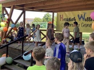 Anschließend führten die Kinder ein buntes Bühnenprogramm auf. Alle Kinder der ersten bis vierten Klassen sangen fröhliche Lieder. Für Begeisterung sorgte auch die Tanzaufführung der Klasse 1a, die noch einmal Schwung in das Programm brachte. Auch die Kinder der Mini-Playback-Show zeigten ihr Können.