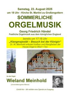 So werden am Samstag, dem 23. August 2025, um 18:00 Uhr, im Orgelkonzert des Universitätsorganisten Wieland Meinhold in der evangelischen Kirche St. Martini zu Großengottern Orgelbearbeitungen Händels mit Originalwerken von Tallis, Philips, Greene, Stanley, Bull, Boyce und Purcell gepaart vorgetragen. Immer steht bei den Fantasien, Preludes, Airs, Trumpet tunes und Voluntarys eine gemessene Repräsentationslust im Vordergrund. Händels Largo, seine Ouvertüre und Doppelfuge g-Moll aber auch die berühmte Pifa und Sarabande dürften auf einer klangvollen Orgel ihre Wirkung ebenso nicht verfehlen.