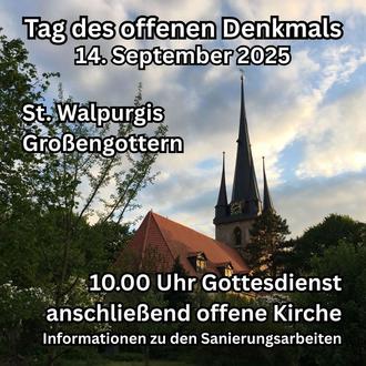 Seit dem 30. Januar des vergangenen Jahres ist die Walpurgiskirche in Großengottern Baustelle. Nach dem Brand wird sie saniert. Nun nähern sich die meisten Arbeiten dem Ende und die Kirche kommt in einen Zustand, in dem sie wieder nutzbar werden wird. Wir haben uns überlegt, am Tag des offenen Denkmals, am 14. September, einen Gottesdienst in der Kirche zu feiern, in dem Zustand, in dem sie dann sein wird und anschließend bei einer Öffnung für Besucher auch Informationen zur abgelaufenen und noch anstehenden Sanierung zu geben. So laden wir herzlich ein, uns an diesem Tag zu besuchen.
