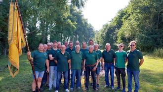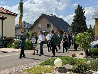 Am Sonntag folgten 10 Schützenvereine aus dem Kreis unserer Einladung. Der Spielmannzug Sachsensiedlung und die Gotter’schen Landfrauen gesellten sich dazu und um 13 Uhr startete die Formation mit der feierlichen Kranzniederlegung am Kriegerdenkmal.