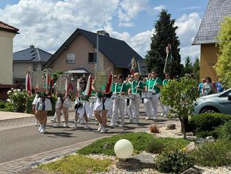 Begleitet vom unüberhörbaren Spielmannszug, gesichert durch Feuerwehr und Polizei, marschierte dann der Zug durch Großengottern zum Königspaar des Vorjahres Silvio Stoye und Susanne Wiederhold. Nach Ehrung mit 3-fachem Salut, kühlem Bier, Schnäpschen, Limonade und herrlichstem Sonnenschein holten wir sie in unsere Marschformation.