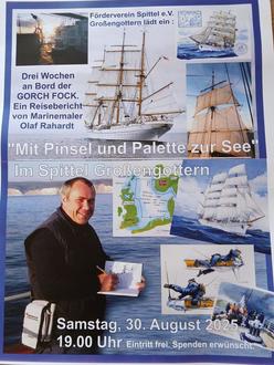 lautet die Überschrift auf unserer Einladung zu einem besonderen Abend mit dem Marinemaler Olaf Rahardt. Der gebürtige Gottersche, der in Rudolstadt lebt, wird in der St. Andreas Kapelle des Spittel über seine Reiseerlebnisse auf der GORCH FOCK berichten.