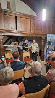 Was war der Anlass? Am Samstag, dem 30. August, hatte die Vorsitzende C. Breitbarth in den Spittel geladen. Olaf Rahardt war zu Gast. Es sollte ein lockerer Abend mit alltäglichen Bildern und Geschichten werden. Zahlreiche Gäste waren gekommen - und wir wurden nicht enttäuscht. Endlich konnte sich ein echter Gotterscher mal zu Hause präsentieren. Nicht jeder Ort hat einen so einzigartigen, vollberuflichen Marinemaler im Binnenland. Sein Arbeitsort ist auf der See, an Bord und in Rudolstadt in Thüringen. Dort ist er Betreiber eines Ateliers und einer Galerie „Bilder von HIER - MEE (-H) R“ in Rudolstadt. Es ist, so Olaf, die weiteste vom Meer entfernte maritime Galerie. Dort findet man Gemälde von hoher Stimmigkeit von Natur und Technik sowie zeittypischer Szenerie. Hauptthema des Abends war aber sein Aufenthalt auf der Gorch Fock vom 16. April bis zum 22. Mai. Gorch ist niederdeutsch und bedeutet Georg, und Fock kam in einem Namen seiner Vorfahren schon mal vor. Die Gorch Fock ist ein Segelschiff der Deutschen Marine, das der Ausbildung von Offizieren - und Unteroffizieren dient. Es fungiert als „Friedensbotschafterin“ Deutschlands. Olaf war Gast auf diesem Schiff, nutzte die Zeit für sein künstlerisches Arbeiten. Er wurde freundschaftlich aufgenommen, seine Zeichnungen konnten jeden Tag besichtigt werden. Im Saal des Kommandanten durfte er arbeiten, auf dem Stuhl, wo einst bereits die Queen saß bei einem Besuch des Schiffes. Olaf berichtete von seinen Erlebnissen in dieser Zeit - spannend, rhetorisch perfekt und emphatisch. Die Zeit verging wie im Fluge. Am Ende seiner Ausführungen wurde er mit Geschenken von unseren Ortsbürgermeister Th. Schneider und unserem ehemaligen Bürgermeister Th. Karnofka überrascht. C. Breitbarth hatte sich extra eine Seemannsmütze aufgesetzt, um das maritime Flair zu unterstützen. Der Abend klang gemütlich aus bei einem Gläschen Wein.
