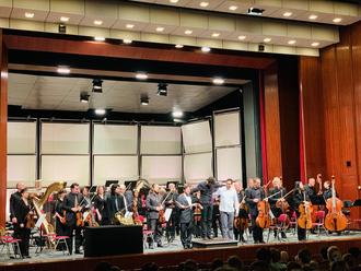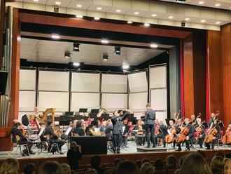 Das dargebotene, hochvirtuose Konzert für Horn und Orchester B-Dur op. 91 des russischen Komponisten Reinhold Glière wurde von Hornisten Bar Zemach höchst eindrucksvoll vorgetragen. Sein feinsinniges Spiel mit den Klangfarben des Horns beeindruckte auch die Schüler*innen. Die gotterschen Schüler*innen erlebten neben anspruchsvollen solistischen Passagen zudem eine Weltpremiere! Die Uraufführung von „Kriat Shema“ - Fantasie für Schofar und Orchester des israelischen Komponisten Amir Shpilman, der auf der Bühne musikalische Ideen seiner Komposition erläuterte.