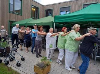 Ein Alleinunterhalter sorgte für gute Stimmung. Sogar einige Rollstuhlfahrer drehten mit uns ein paar Runden. Auch hier trugen die Landfrauen mit Kuchen zum Gelingen des Festes bei. Auch die Pfleger/innen wurden damit unterstützt.