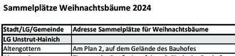Im Januar 2024 werden in den Städten und Gemeinden Sammelplätze für die gebührenfreie Weihnachtsbaumentsorgung von privaten Haushalten zur Verfügung gestellt. Die Lage der Sammelplätze und die jeweiligen Abfuhr- bzw. Abgabetermine sind der nachfolgenden Übersicht zu entnehmen, welche ebenfalls auf der Homepage des Abfallwirtschaftsbetriebes www.abfallwirtschaft-uhk.de veröffentlicht wird. Nutzer eines Bioabfallbehälters können den Weihnachtsbaum im Januar am jeweiligen Leerungstermin auch neben ihrem Bioabfallbehälter bereitlegen. Es werden nur vollständig abgeschmückte, auf 1,50 m gekürzte Weihnachtsbäume ohne Verpackung mitgenommen.