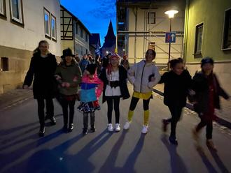 Kurz nach 18.00 Uhr versammelten sich alle zum gemeinsamen Umzug. Dieser wurde angeführt mit Musik vom Band und einem klasse Trommel-Solo. Dabei gingen überall im Dorf die Türen und Fenster auf, um das Spektakel zu bestaunen.