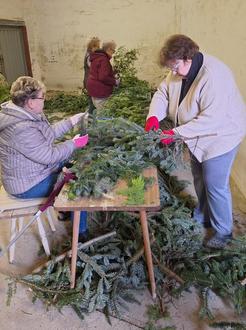 Tanne und Buchsbaum hatten wir genügend zur Verfügung. So konnte es losgehen. Eine Gruppe schnitt die Tanne, andere begannen mit dem Binden. Es dauerte doch einige Stunden, bevor wir mit unserem Werk zufrieden waren.