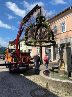 Dieses Mal waren wir besonders motiviert - der MDR hatte sich angesagt. Es sollte ein Bericht im Radio und auch im Fernsehen gesendet werden. Da wir ja schon Routine haben, lief alles wie am Schnürchen. Wieder stellte R. Moritz ihre Räumlichkeiten zur Verfügung - DANKE, liebe Renate - auch für die gemütliche Kaffeetafel. Einige Frauen bereiteten die Handsträuße, andere umwickelten die Osterkrone. Das Team des MDR half ein wenig, stellte Fragen. So erklärte E. Blankenburg die Bedeutung der Osterkrone. In der Regel sind die Brunnen ab der Karwoche bis 2 Wochen nach Ostern geschmückt. Doch natürlich gibt es von Ort zu Ort Besonderheiten. Die Intention ist, dass die Brunnen nie versiegen mögen. Die 4 Säulen bedeuten: Glaube, Hoffnung, Sorge und Dank. Marc Neblung (MDR) fühlte sich sichtlich wohl bei uns mit seinen 2 Mitarbeitern. Natürlich gab es Kaffee und Kuchen. Der abendliche Beitrag wurde von vielen Bürgern und Bürgerinnen unseres Ortes angeschaut - das Feedback war durchaus positiv. Nun folgt noch die offizielle Einweihung am Ostersamstag.
