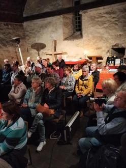 Frau Klein, Vorsitzende des Fördervereins, begrüßte die Gäste und wies darauf hin, stolz zu sein, wenn ehemalige Gottersche Ideen entwickeln, um dieses historische Gebäude mit Leben zu erfüllen.Gedichte, wie „Es war einmal ein Lattenzaun“ oder „Das Wasser rann mit Zasch und Zisch“ u.a.wurden so hervorragend vertont. Begeistert hörte zu, als Andreas das selbst verfasste Lied „Die Uhr“ vortrug.