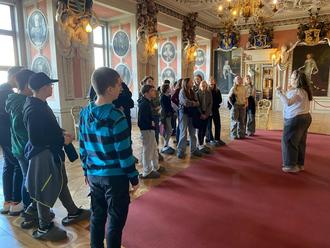 Das nächste Reiseziel war eine Führung durch das Schloss Friedenstein. Die Kinder waren beeindruckt von der Größe des Schlosses. Während der Führung durch das Schloss kamen sie auch am Schlafzimmer sowie am Gesprächszimmer und am Esszimmer der herzoglichen Familie vorbei. Schließlich konnten sie auch den Thronsaal bewundern. In der Kunstkammer waren Schätze aus aller Welt ausgestellt. Hier sind Kunstwerke aus Elfenbein, Bernstein und Silber zu sehen. Beeindruckend war zum Beispiel ein Schachbrett aus Bernstein oder ein Elefant aus vergoldetem Silber, sogar vergoldete Trinkgefäße. Die Geschichte des Schlosses geht bis zu 400 Jahre zurück.
