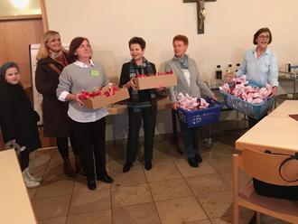 Im weihnachtlichen Ambiente und an festlich gedeckten Tischen fand dann zur Freude der Gäste eine kleine Bescherung statt. Eine Tüte Naschereien, gespendet von einer Familie aus Schiffweiler, und ein Überraschungsbeutel mit nützlichen kleinen Geschenken, zusammengestellt von der Pfarrgemeinde.