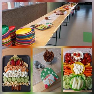 Viele fleißige Helfer*innen bauten das Buffet auf (und räumten im Anschluss auch wieder auf), belegten frische Brote, richteten her, schnippelten Obst und Gemüse und legten damit liebevoll Figuren wie Schneemann, Eule, Weihnachtskugel und Tannenbaum. Dazu gab es Müsli, Milch, warmen Kinderpunsch und andere Getränke.