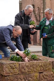 Bürgermeister Markus Fuchs, Pastor Joachim Schneider, Ortsvorsteher Dominik Dietz, Petra Nix vom Demenzcafé und Vertreter des Obst- und Gartenbauvereins Leopoldsthal-Graulheck haben kürzlich die schönen Frühblüher am Walter-Becker-Platz gepflanzt und damit auch für Schiffweiler ein starkes Zeichen gesetzt.