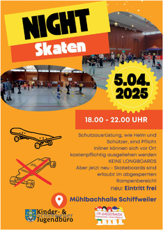 Das Kinder- und Jugendbüro der Gemeinde Schiffweiler sowie die Rasselbande freuen sich auf eine unvergessliche Skate-Nacht mit euch.