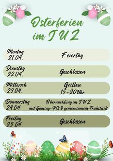 | • | Donnerstag, 24.04. – Übernachtung im JUZ mit Gaming-PCs & gemütlichem Frühstück am nächsten Morgen. Anmeldung erforderlich! |
