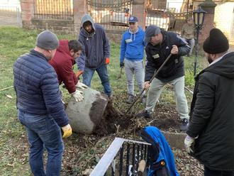 Die Entsorgung der Pflanzabfälle übernahm Heribert Marx. Die pflanzfertig vorbereiteten Beete im Eingangsbereich wurden anschließend von Carola Holzer, die die ganze Aktion nicht nur initiiert sondern auch organisiert hatte, mit insektenfreundlichem Lavendel und einer Unterbepflanzung neu eingepflanzt. Die Pflanzkübel vor dem Pfarrheim erhielten eine Bepflanzung mit Frühlingsblühern in den Landesfarben der Ukraine als Zeichen der Wertschätzung. Zur Überwindung von Sprachbarrieren stand Ludmilla Alt als Dolmetscherin zur Verfügung. Nach den anstrengenden Arbeitseinsätzen wartete auf die fleißigen Helferinnen und Helfer, ein schmackhaftes Mittagessen, zubereitet von Franziska Carrouée, die es übernommen hatte, für das leibliche Wohl zu sorgen. Nach Beendigung der Aktion bedankte sich Pastor Schneider bei allen Beteiligten, insbesondere bei den Ukrainern für ihren großen Einsatz und zeigte sich erfreut, dass sich das Gelände wieder in einem ansehnlichen Zustand befindet.