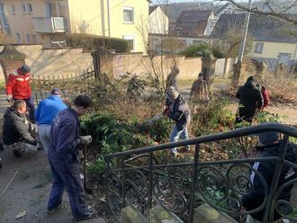 Seit Sommer letzten Jahres bietet der Pfarrbezirk Herz-Jesu im Pfarrheim Landsweiler auf Initiative von Gemeindereferentin Brigitte Philippi jeden Dienstagnachmittag ein Begegnungscafé für ukrainische Geflüchtete an. Bei Kaffee, Tee und Gebäck haben die Besucher nicht nur Gelegenheit zum gegenseitigen Austausch, sondern erfahren auch Unterstützung beim Ausfüllen von Formularen und beim Umgang mit Behörden. Soweit vorhanden besteht auch die Möglichkeit sich mit gespendetem Hausrat und Kleidung einzudecken. Darüber hinaus wird auch Deutschunterricht angeboten. Für einen geregelten Ablauf der Begegnungsnachmittage sorgen Helferinnen aus der Pfarrei. Diese ganze Unterstützung wird von den Geflüchteten dankbar angenommen. Diese Dankbarkeit wollten diese auch gerne zeigen. So erreichten die Helferinnen öfter die Anfrage von den Geflüchteten, „ob sie nicht etwas tun könnten“. Im Focus stand dabei die Außenanlage um Pfarrheim und Pfarrhaus, die mit Wildwuchs überwuchert war. Auf Initiative von Carola Holzer vom Team Herz-Jesu wurde dann In mehreren Arbeitseinsätzen und insgesamt 150 Arbeitsstunden mit großem Kraftaufwand Wildtriebe und Brombeerranken mitsamt den Wurzelstöcken entfernt und das gesamte Gelände gesäubert. Nicht nur die Männer, sondern auch die Frauen aus der Gruppe legten bei dieser anstrengenden Arbeit tatkräftig mit Hand an, unterstützt von weiteren Mitgliedern des Teams Herz-Jesu.