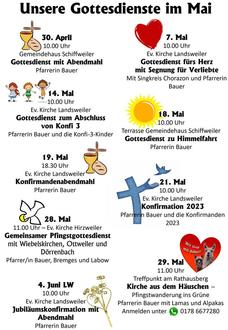 | 10.00 Uhr | Gottesdienst zu Himmelfahrt, Terasse Gemeindehaus Schiffweiler |
