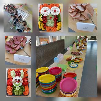 Viele fleißige Helfer*innen bauten das Buffet auf (räumten im Anschluss auch wieder auf und spülten), belegten Brote, richteten her, schnippelten Obst und Gemüse und legten damit liebevoll Figuren. Eule, Hase und Schmetterling strahlten den Kindern vom Buffet entgegen, Käse-Trauben-Spieße, Obst, saure Gurken, Eier luden zum Zugreifen ein. Viele begeisterte Kinder, die sich mehrmals am schön hergerichteten Buffet bedienten, belohnten die Mühe und Sorgfalt. Für alle war es eine willkommene Abwechslung im Schulalltag und ein schöner Start ins lange Wochenende!