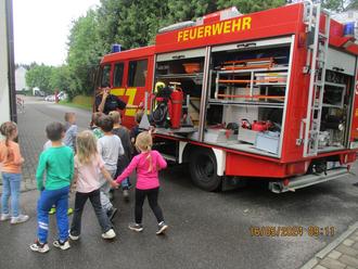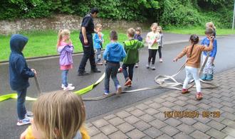Bevor es vor die Tür ging, um dort das Feuerwehrauto zu besichtigen und einen Löschangriff aufzubauen und gemeinsam ein „Feuer“ zu löschen, wurden noch verschiedene Gerätschaften der Feuerwehr besprochen und auch die Feuerwehrkleidung genauestens unter die Lupe genommen.
